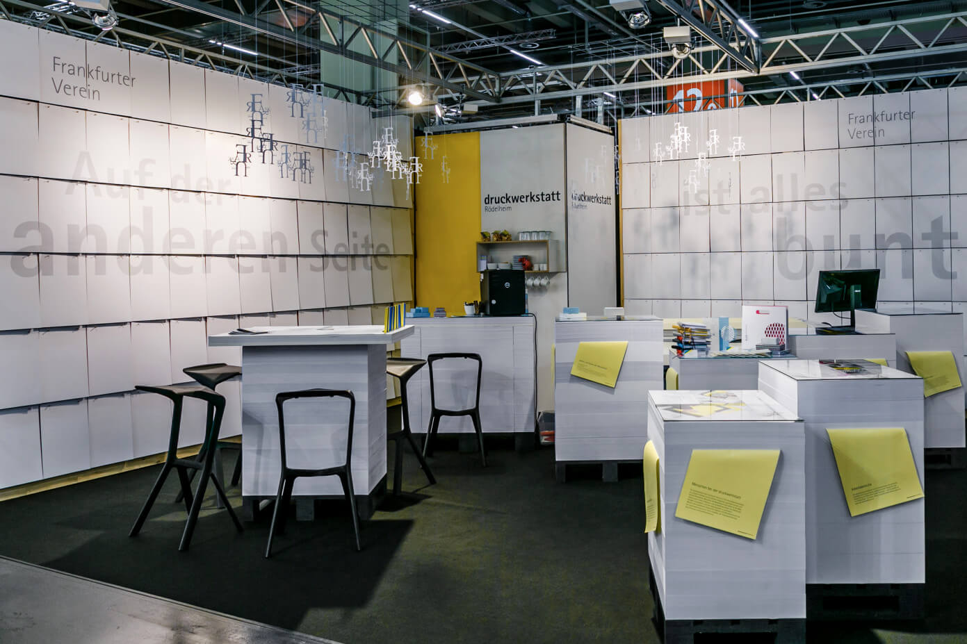 Dadurch verändert der Messestand im Laufe der Zeit seine Farbe von einem weißen Motiv zu einem bunten. Die Farbänderung versinnbildlicht den Druckprozess vom unbedruckten zum bedruckten Papier. Darüberhinaus dienen Papierstapel als Podeste für Exponate und Ausstellungsflächen.